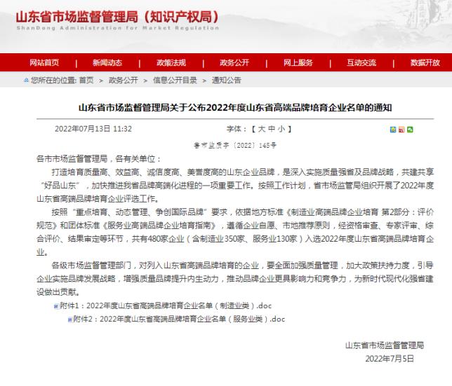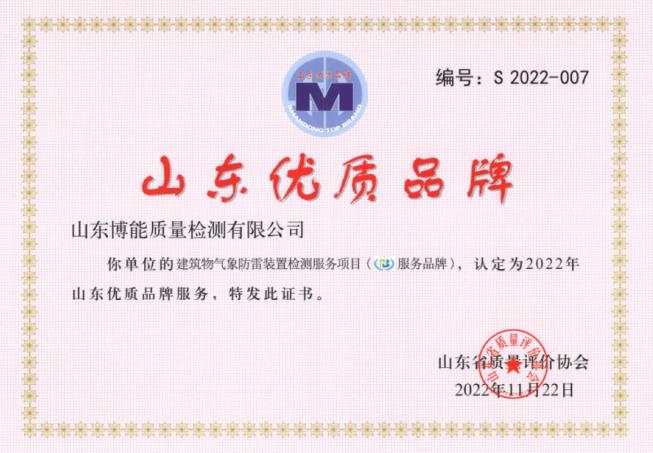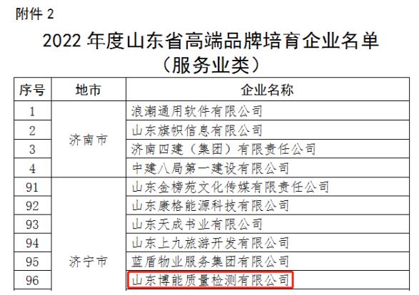 山東省市場監管局發布《關于公布2022年度山東省高端品牌培育企業名單的通知》,公布入選企業名單,山東博能質量檢測有限公司成功入選,并獲得山東省質量評價協會頒發的榮譽證書。